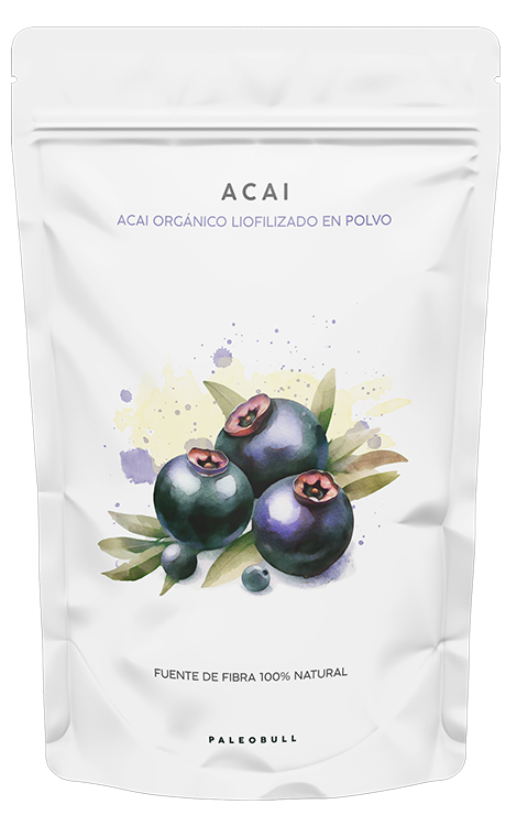 El polvo de acai se obtiene mediante un proceso de liofilización del fruto completo, no solo del jugo o zumo como hacen otras opciones que hay en el mercado. De este modo se preservan todas las propiedades presentes de forma natural en los frutos del acai.